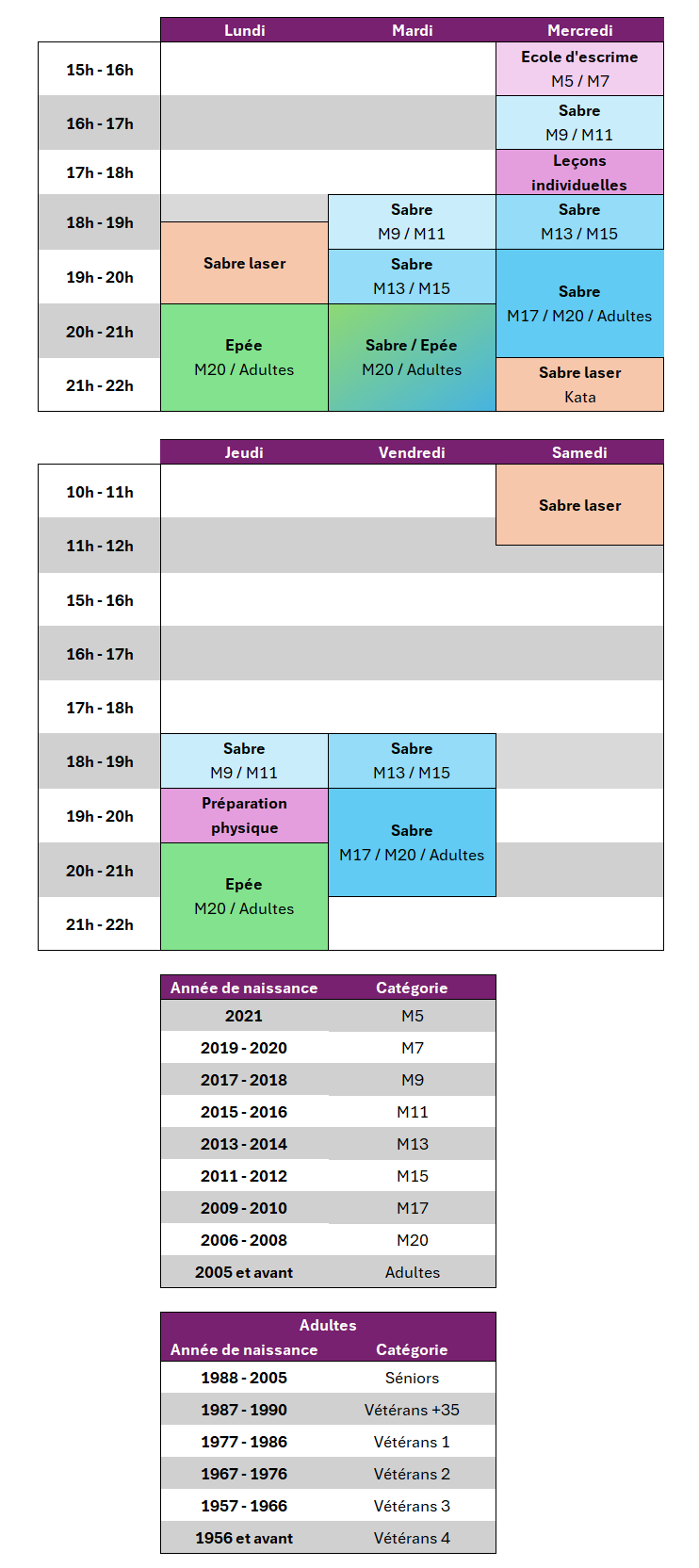 Les entrainements (horaires)