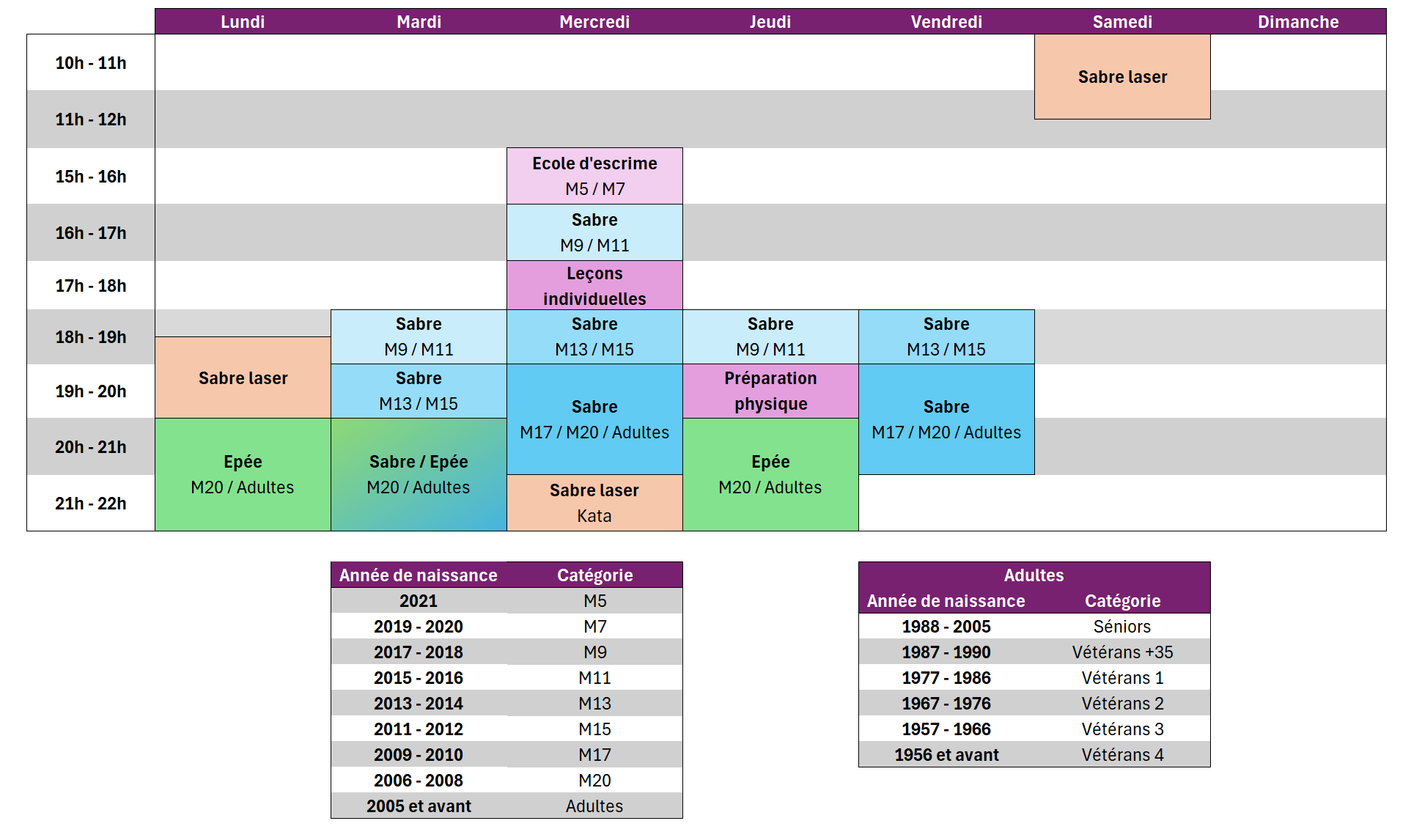 Les entrainements (horaires)